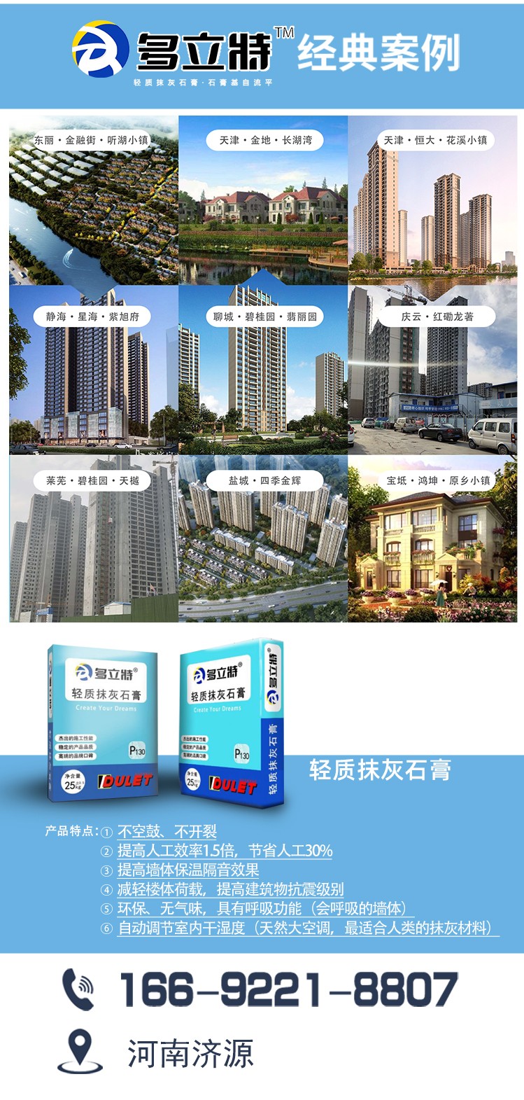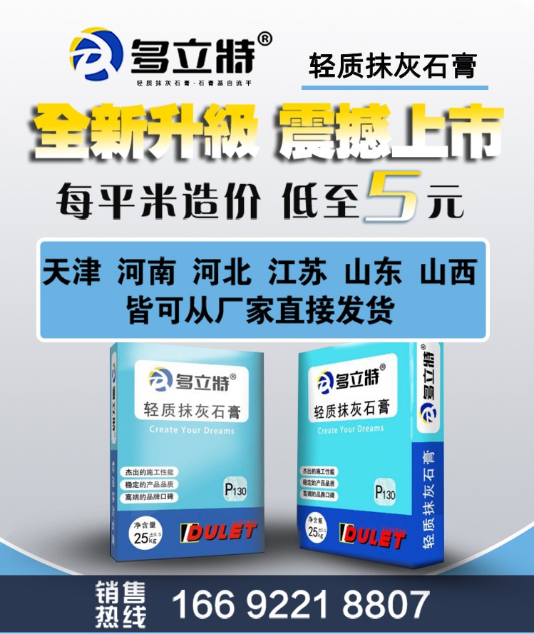 多立特天津廠區(qū)成立于2009年,公司于2012年開始駐足于石膏產(chǎn)品的研發(fā),目前室內(nèi)石膏產(chǎn)品已相當(dāng)成熟及穩(wěn)定,公司于2019年成立多立特山東廠區(qū),以便發(fā)展壯大室內(nèi)石膏事業(yè)而努力,現(xiàn)為了開拓南方市場特臨近原材料區(qū)成立濟(jì)源多立特新型建材有限公司。